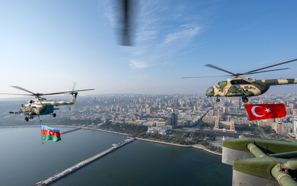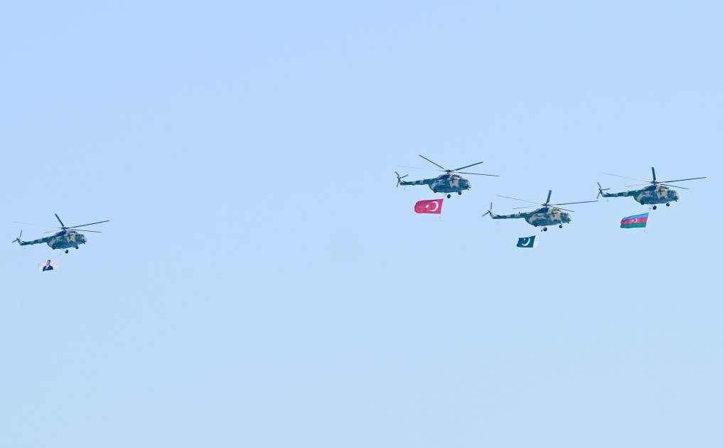 Azərbaycan və Türkiyə pilotlarının iştirakı ilə aviasiya nümayiş uçuşları isə izləyicilər üçün unudulmaz olub. Parad çərçivəsində uçan Mİ-17 döyüş-nəqliyyat helikopterləri Azərbaycan, Türkiyə və Pakistan respublikalarının Dövlət bayraqlarını daşıyıb, Mİ-17 helikopteri Ümummilli Lider Heydər Əliyevin portretini nümayiş etdirib. Həmçinin uzaqmənzilli hava-yer tipli raketlərlə təchiz olunmuş Mİ-17 döyüş-nəqliyyat helikopterləri, MFİ-17 təlim təyyarələri, L-39 təlim təyyarələri, İL-76 hərbi-nəqliyyat və silahlanmaya yeni qəbul edilmiş C-27J yük təyyarələri, silahlanmaya yeni qəbul edilmiş JF-17 (Cİ EF) çoxməqsədli qırıcı təyyarələr, Türkiyə Hərbi Hava Qüvvələrini təmsil edən F-16 çoxməqsədli qırıcı təyyarələr, modernizasiya olunmuş SU-25-Laçın hücum təyyarələri iftixar dolu hisslər yaşadıb. SU-25 hücum təyyarələri isə Azərbaycan Bayrağının rənglərini paytaxt səmasında canlandırıb.