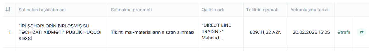 Satınalma üzrə qalib qismində Direct Line Trading MMC-dir. Şirkətlə 629.111,22 AZN məbləğində müqavilənin bağlanacağı gözlənilir.