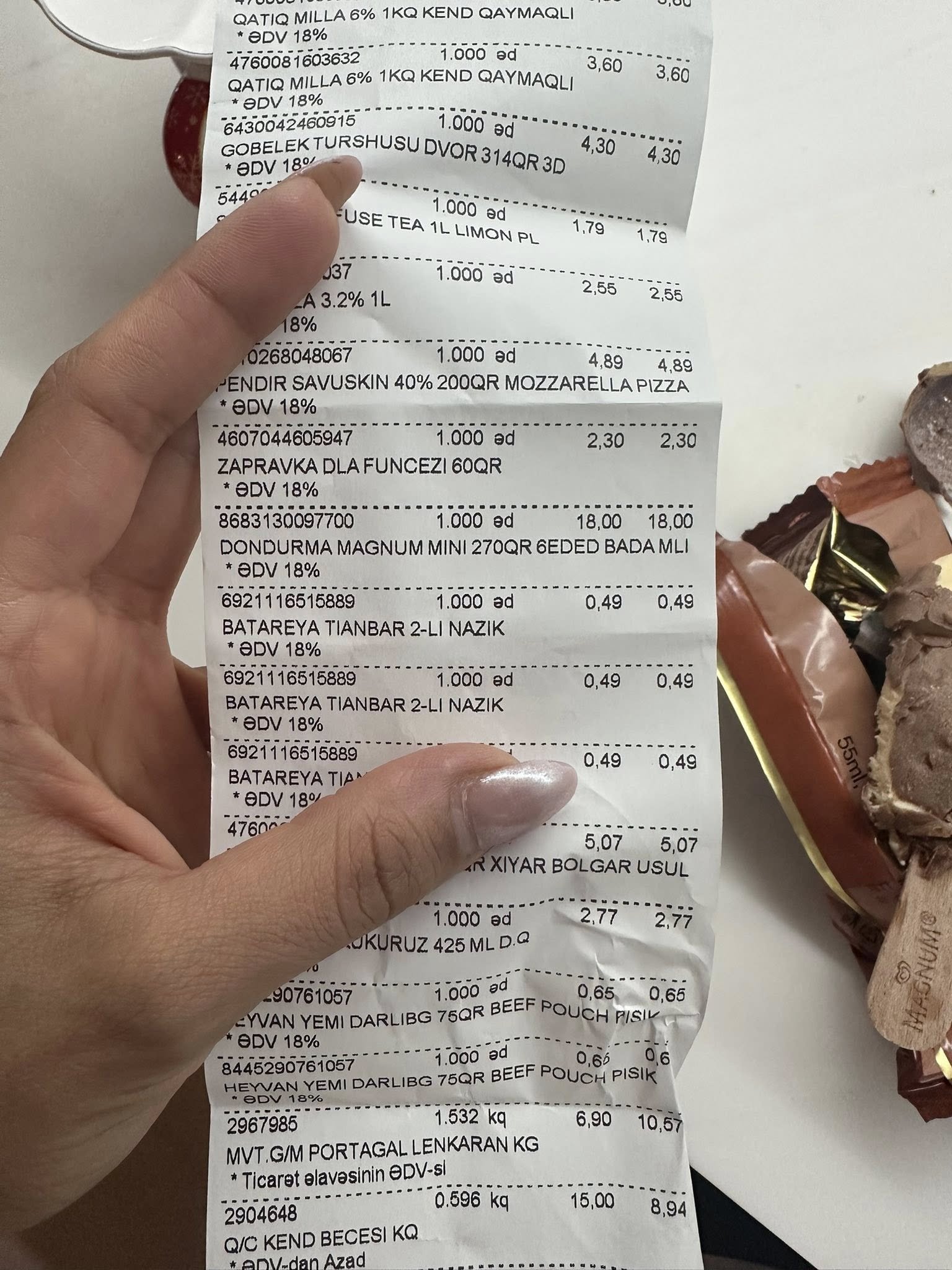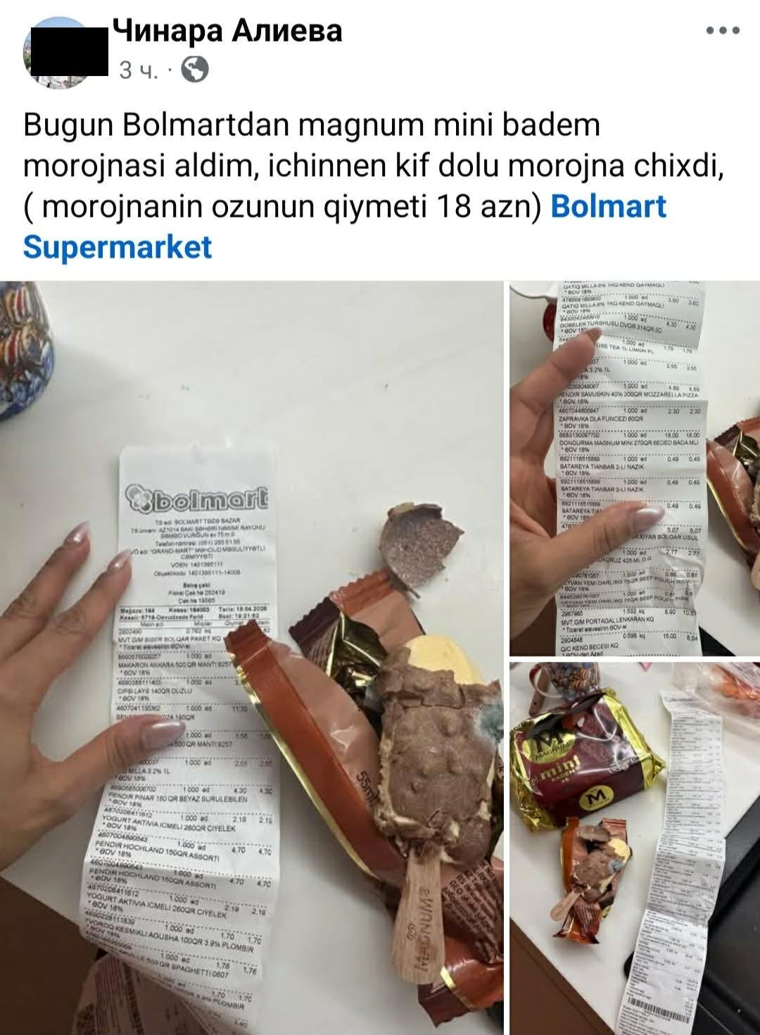 “Müştəriyəm şikayətim var” sosial qrupunda Çinarə Əliyeva adlı vətəndaş paylaşım edərək Bolmartdan 18 manata aldığı dondurma kifli çıxdığı barədə şərh yazıb: O qeyd edib ki, “Bolmartdan magnum mini badem morojnasi aldim, ichinnen kif dolu morojna chixdi,( morojnanin ozunun qiymeti 18 azn)” deyə qeyd edib.