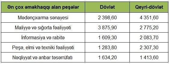 Məlumata görə, mədənçıxarma sənayesində, maliyyə və sığorta fəaliyyəti, informasiya və rabitə, peşə, elmi və texniki fəaliyyət, eləcə də nəqliyyat və anbar təsərrüfatı sahələrində orta aylıq nominal əməkhaqqı ölkə üzrə orta göstəricidən yüksək olub.