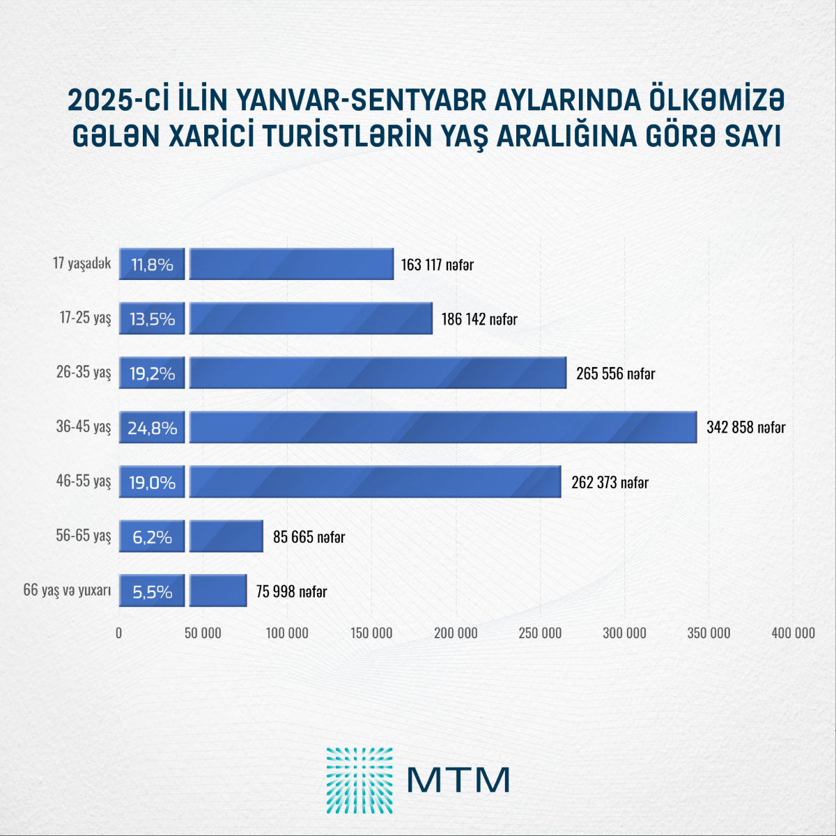 Media Təhlil Mərkəzinin (MTM) Dövlət Statistika Komitəsinin açıqladığı rəsmi rəqəmlər əsasında apardığı təhlilə görə, 2025-ci ilin yanvar-sentyabr aylarında Azərbaycana turizm məqsədilə gələn xarici vətəndaşların sayı 1 381 709 nəfər təşkil edib.
