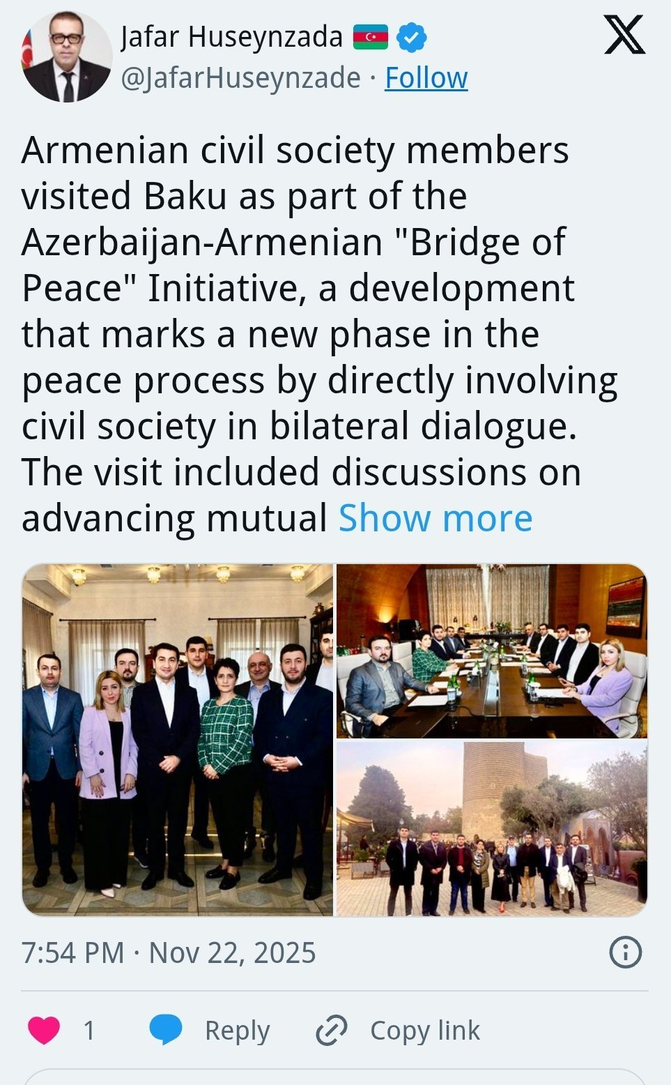 "Erməni vətəndaş cəmiyyəti üzvləri Azərbaycan-Ermənistan "Sülh Körpüsü" Təşəbbüsü çərçivəsində Bakıya səfər ediblər. Bu hadisə ikitərəfli dialoqa vətəndaş cəmiyyətinin birbaşa cəlb olunması ilə sülh prosesində yeni mərhələni ifadə edir. Səfər zamanı qarşılıqlı anlaşmanın inkişafı və mümkün birgə layihələrin müzakirəsi aparılıb, media əməkdaşlığının gücləndirilməsi və ekspertlər arasında birbaşa əlaqələrin qurulması barədə razılıqlar əldə olunub", - o qeyd edib.